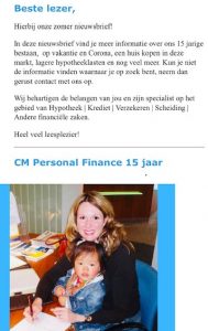 In deze nieuwsbrief vind je meer informatie over ons 15 jarige bestaan, op vakantie en Corona, een huis kopen in deze markt, lagere hypotheeklasten en nog veel meer. Kun je niet de informatie vinden waarnaar je op zoek bent, neem dan gerust contact met ons op.